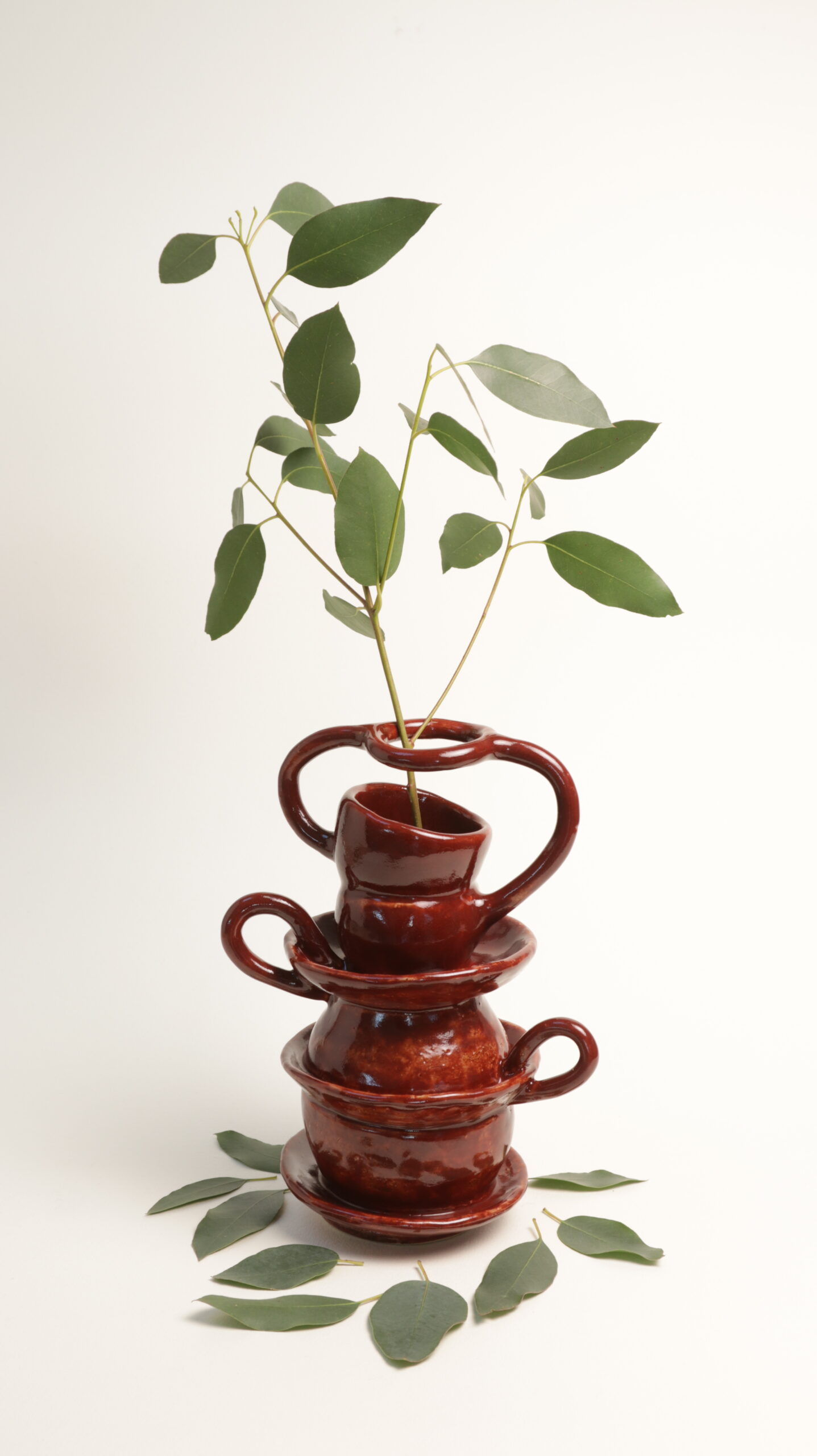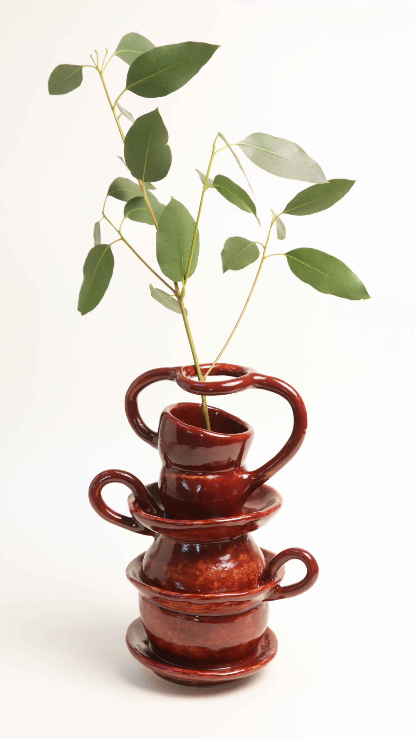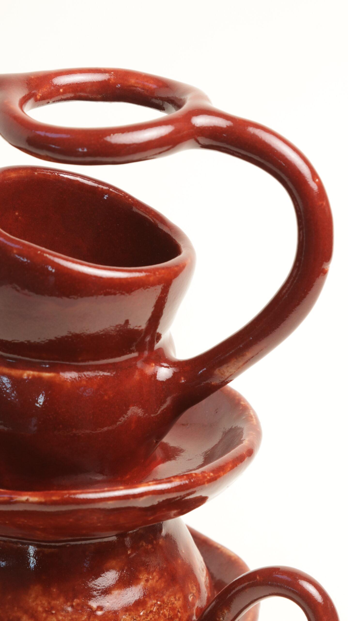 Red vase that is build up from piled espresso cups with handles that keep thins toghether